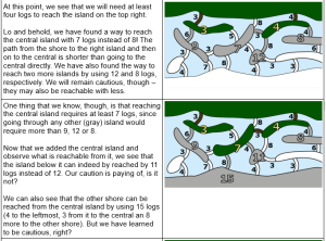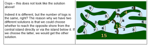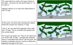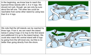If you are not new to Bebras, you must had seen tasks in which you have to find the shortest path between two points. Building a dam with the the least number of logs is the same as finding the shortest path from one side of the river to another, where the length of the path segments is measured by the number of logs.