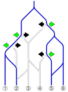 Along the water canals, the beavers have installed four water gates, where the water can only flow either to the left or to the right.