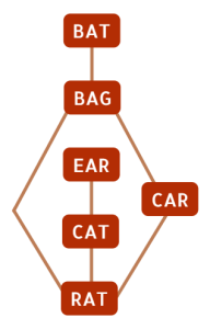 我们可以从计算每个节点的出边数量开始。有 2 个节点有 3 条边,2 个节点有 2 条边,还有 2 个节点有 1 条边。只有一个节点有 1 条边,且这条边连接到一个有 2 条边的节点。这样我们就确定了“EAR”和“CAR”对应的节点。我们可以继续用这种方法。