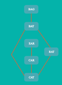 We can proceed by counting the edges going from each node. There are 2 nodes with 3 edges, 2 nodes have two edges and 2 nodes have 1 edge. There is only one node with one edge connected to a node that has two edges. So we have identified the node for “EAR” and “CAR”. We can continue with this method.