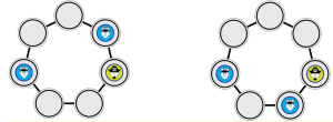 我们假设是警方迫使海盗陷入上述局面,且轮到海盗走(所以海盗输了)。警方的上一步棋之前棋盘是什么样子的?警方移动了其中一名警察向上或向下。由于棋盘是对称的,我们假设移动的是右边的警察;左边警察的情况是一样的。因此,之前的局面是这样的。