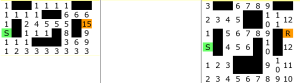 要找到一些最短路径(连接器序列)并不难。你可以想象一个波浪在电路板上逐个接触点地扩散开来,从 S 点开始向 R 点移动。当波浪到达某个接触点时,它肯定已经经过了最少数量的连接器(波浪的“步数”)。