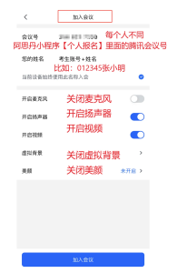 ②点击加入会议,输入会议号,参会名称务必改为考生账号+姓名,如“012345 张小明”。会议号和密码、考生账号等信息以微信小程序